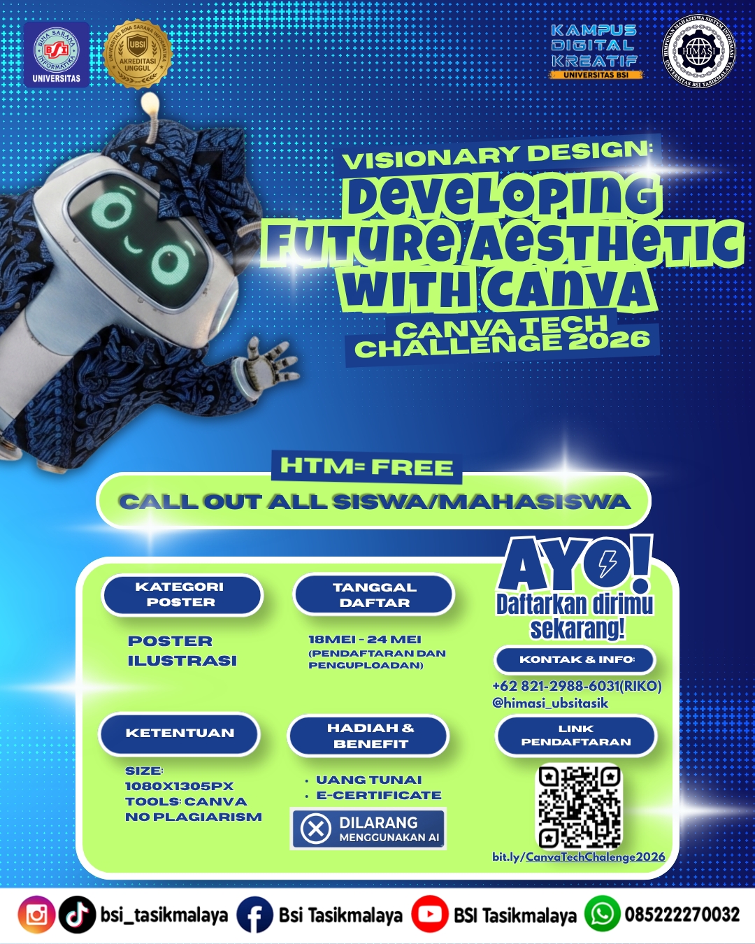 TasikmalayaHitz, Himpunan Mahasiswa Sistem Informasi (HIMASI) Universitas Bina Sarana Informatika (UBSI) Kampus Kota Tasikmalaya kembali menghadirkan kegiatan kreatif dan inovatif melalui Canva Tech Challenge 2026 dengan mengusung tema “Visionary Design: Developing Future Aesthetic with Canva”. Kegiatan ini merupakan perlombaan desain poster digital yang diselenggarakan secara daring sebagai wadah bagi pelajar tingkat SMA/SMK/sederajat, mahasiswa, serta masyarakat umum di wilayah Priangan Timur untuk menyalurkan ide dan kreativitas mereka dalam bidang desain grafis.