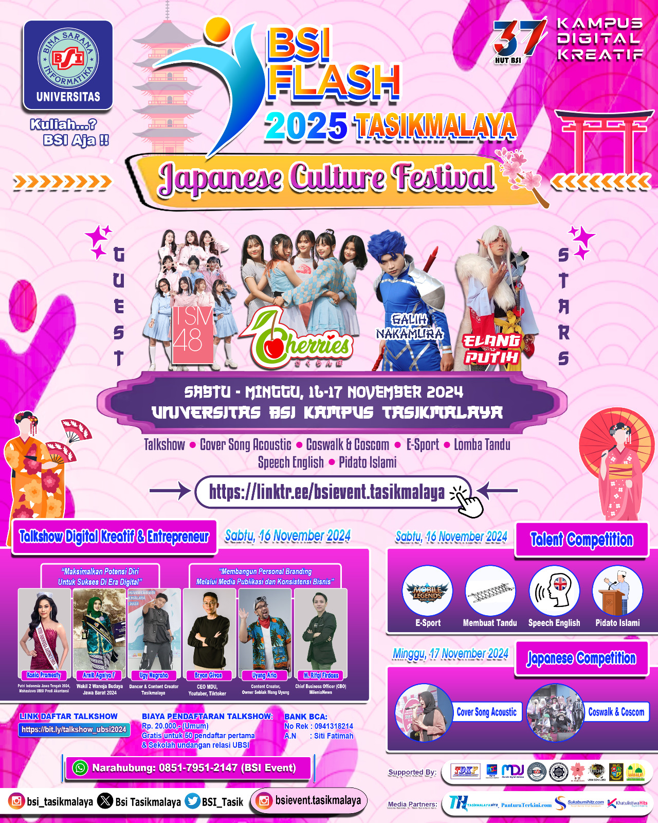 Event BSI Flash 2025 ini tidak hanya ada perlombaan, buat kamu juga yang ingin menambah wawasan yang bisa menginspirasi kamu untuk berkembang, kamu bisa mengikuti kegiatan Talk Show Digital Kreatif dan Entrepreneur pada hari sabtu 16 November 2024, dengan narasumber yang sangat menarik diantaranya Kania Pramesty (Putri Indonesia Jawa Tenagh 2024), Arnik Agniya F (Wakil 2 Wanoja Budaya Jawa Barat 2024), Ugy Nugraha (Dancer dan Content Creator Tasikmalaya), Bryan Givan (CEO MDU, Youtuber, Tiktoker), Uyung Arya (Content Creator, Owner Seblak Mang Uyung) dan .M. Rifqi Firdaus (Chief Business Officer MilenialNews). Acara ini akan menjadi momen yang tak terlupakan bagi kamu dan untuk belajar dan terinspirasi. Kamu bisa daftar di https://bit.ly/talkshow_ubsi2024