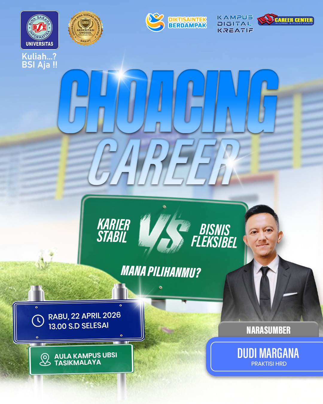 Dalam menghadapi dinamika dunia kerja yang semakin kompetitif dan penuh tantangan, mahasiswa dituntut untuk memiliki arah dan perencanaan karier yang jelas sejak dini. Menjawab kebutuhan tersebut, Universitas Bina Sarana Informatika (UBSI) Kampus Tasikmalaya menyelenggarakan kegiatan Coaching Career 2026 sebagai wadah pembekalan bagi mahasiswa dalam menentukan pilihan masa depan.