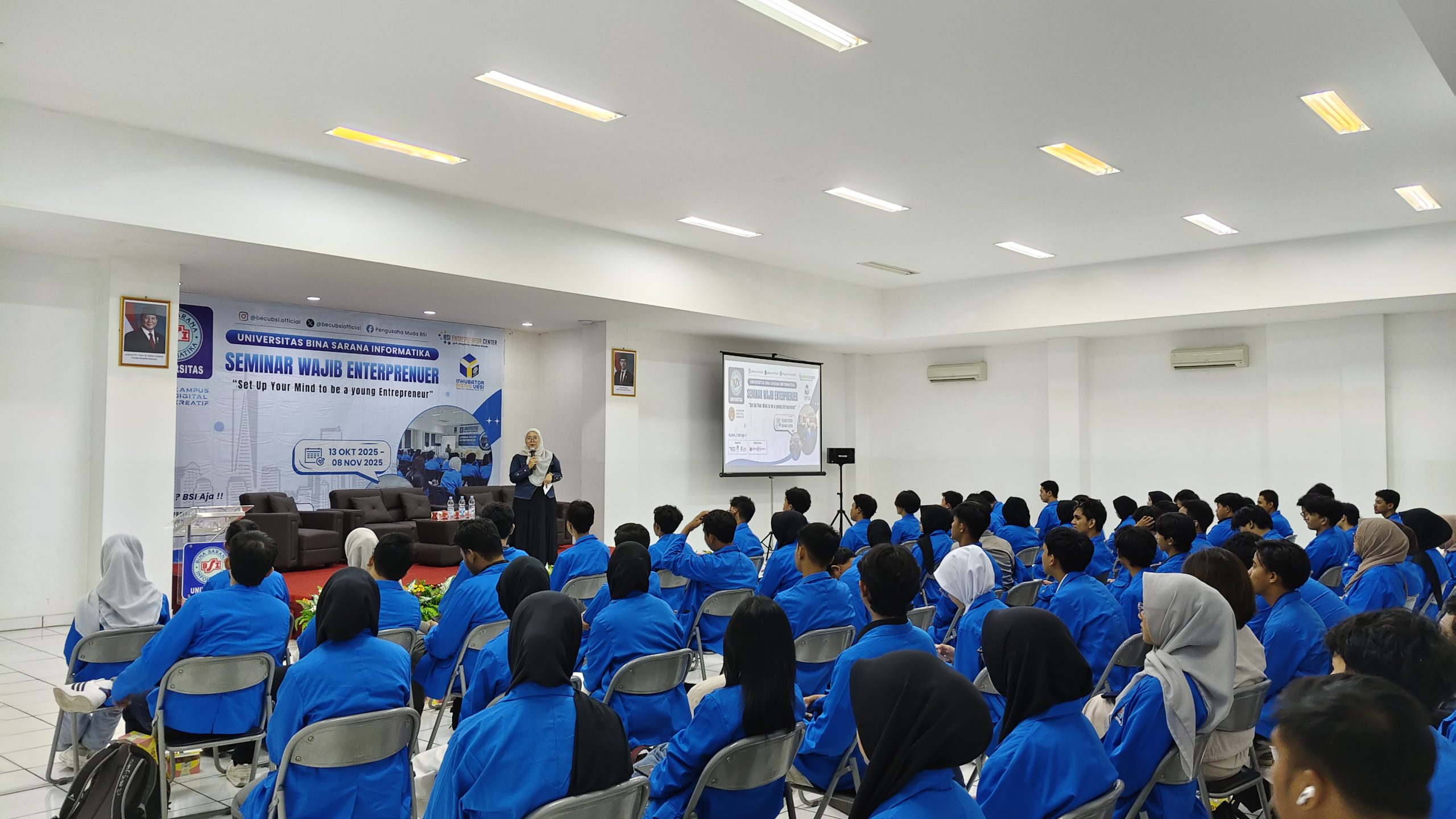 TasikmalayaHitz, Tasikmalaya – Dalam upaya menumbuhkan semangat kewirausahaan di kalangan mahasiswa, Universitas Bina Sarana Informatika (BSI) menyelenggarakan Seminar Wajib Entrepreneur dengan tema “Set Up Your Mind to Be Young Entrepreneur” pada Senin, 30 Oktober 2025, pukul 13.30–16.00 WIB. Kegiatan ini dipandu oleh Dini Silvi Purnia S.Kom, M.Kom selaku pembawa acara, yang dengan penuh semangat membuka jalannya kegiatan dan menjaga suasana tetap hidup serta interaktif. Seminar ini menghadirkan dua alumni sukses BSI yang telah berkiprah di dunia bisnis, yaitu Riza Rinzana, pengusaha di bidang komputer melalui CV Megah Glory, serta Kainda, pendiri brand kuliner khas Sunda “To Ti Tasik” yang kini dikenal hingga ke luar negeri.
