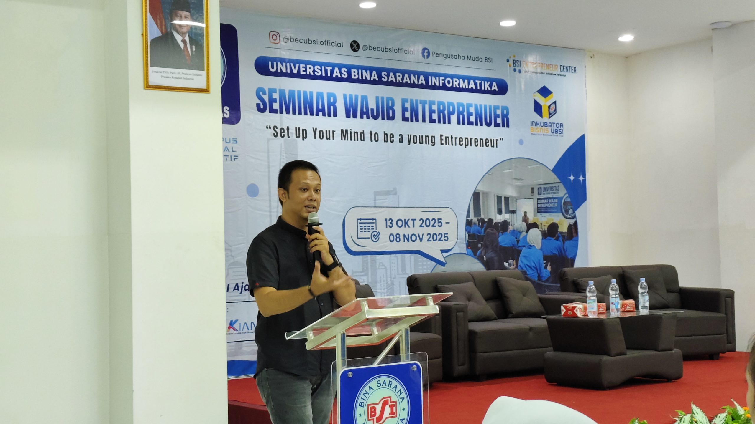 TasikmalayaHitz, Tasikmalaya – Dalam rangka menumbuhkan semangat kewirausahaan di kalangan mahasiswa, Universitas Bina Sarana Informatika (UBSI) Kota Tasikmalaya menyelenggarakan seminar wajib entrepreneur dengan mengangkat tema “set up your mind to be young entrepreneur”. Kegiatan ini menghadirkan narasumber inspiratif Riza Rinzana pengusaha muda sukses di bidang bisnis komputer yaitu CV Megah Glory, sekaligus alumni UBSI angkatan 2010. Dalam penyampaian materinya, Riza berbagi pengalaman perjalanan karirnya dalam membangun bisnis dari awal hingga berhasil mendapatkan kepercayaan dari berbagai mitra. Ia menegaskan bahwa kesuksesan tidak hanya datang dari faktor keberuntungan, tetapi juga dari keberanian untuk memulai dan terus belajar.