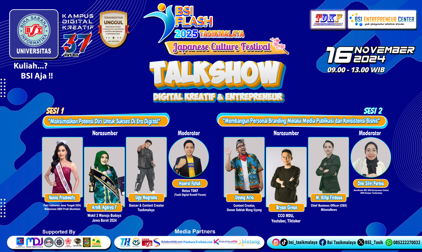 Acara Talkshow ini merupakan rangkaian acara dari event BSI FLASH 2025 Tasikmalaya “Japanese Culture Festival” yang diselenggarakan mulai tanggal 16 sampai 17 November 2024. BSI Flash Tasikmalaya ini terdiri dari beberapa kegiatan, yaitu Talkshow Digital Kreatif & Entrepreneur, lomba esport, lomba membuat tandu daruratm lomba speech english, lomba pidato islami, lomba cover song acoustic, lomba coswalk, coscom dan cosplay budaya jepang, serta puncak acaranya adalah penampilan dari para guest stars, yaitu TSM 48, Cherries, Galih Nakamura dan Elang Putih.